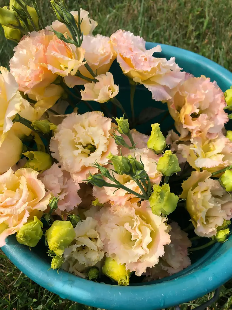 Еустома має великі, пишні квіти з шовковистими пелюстками білого, рожевого, лавандового, фіолетового та навіть синього кольору (дуже ефектно). Ще є двоколірні сорти з градієнтними переходами між відтінками. На кожній стеблині по 10-20 бутонів, і вони розпускаються не всі одразу, а почергово. Завдяки цьому кущик зберігає квітучий вигляд досить довго. Спочатку з’являються одні квіти, потім наступні, і так з липня до вересня та навіть до жовтня, якщо осінь тепла.