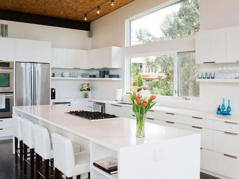 Островки в форме квадрата органично вписываются в угловой или квадратный тип планировки. Они экономят пространство и оказываются важным помощником, вмещая в себя достаточное количество кухонных девайсов.